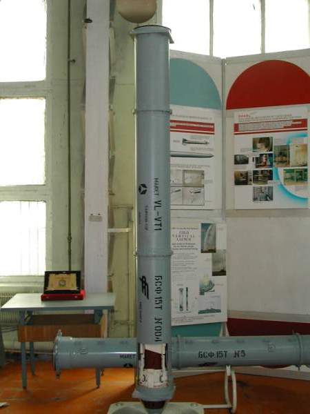 Разрезной макет транспортно-пускового контейнера с зенитной ракетой. Виден блок газодинамического управления для склонения ракеты на старте и довороте на цель на конечном участке полета (он же отдельно лежит на столе за головным обтекателем).